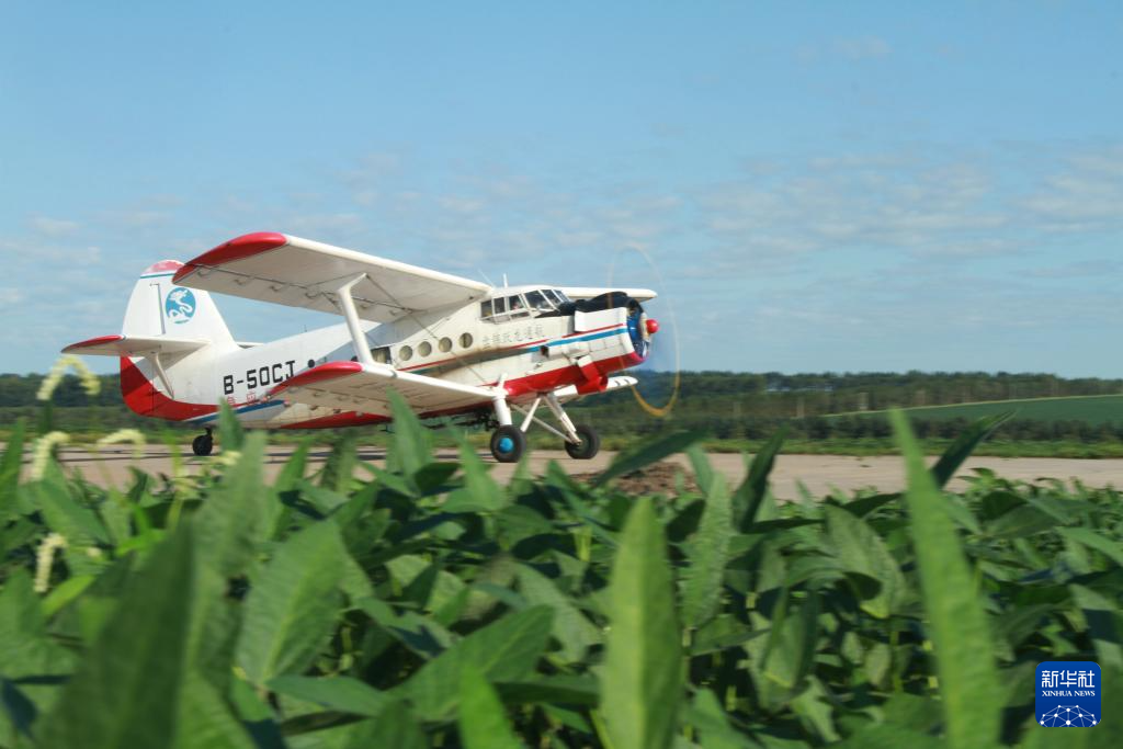 8月2日,在北大荒集团黑龙江尖山农场有限公司农业科技服务中心玉米田,农用飞机起飞准备喷施叶面肥。