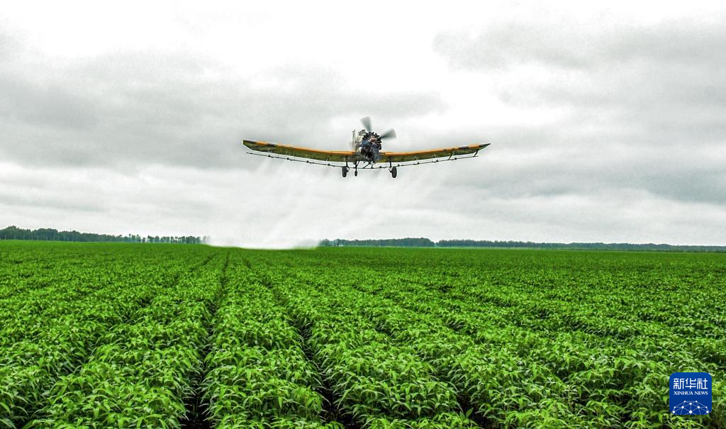 8月2日,农用飞机在黑龙江北大荒农业股份有限公司友谊分公司大豆地块进行航化作业。
