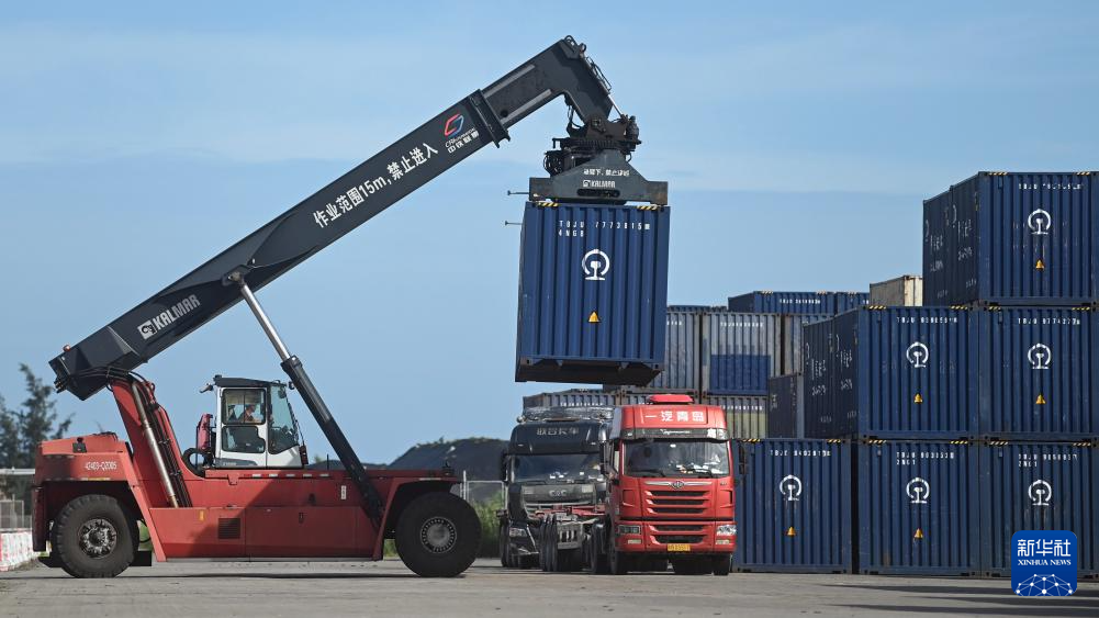 在钦州铁路集装箱中心站货场,一辆正面吊车在给货车装运集装箱(8月1日摄)。