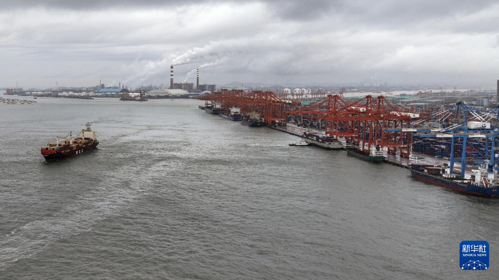在钦州港码头,一艘货轮驶离钦州港(7月31日摄,无人机照片)。