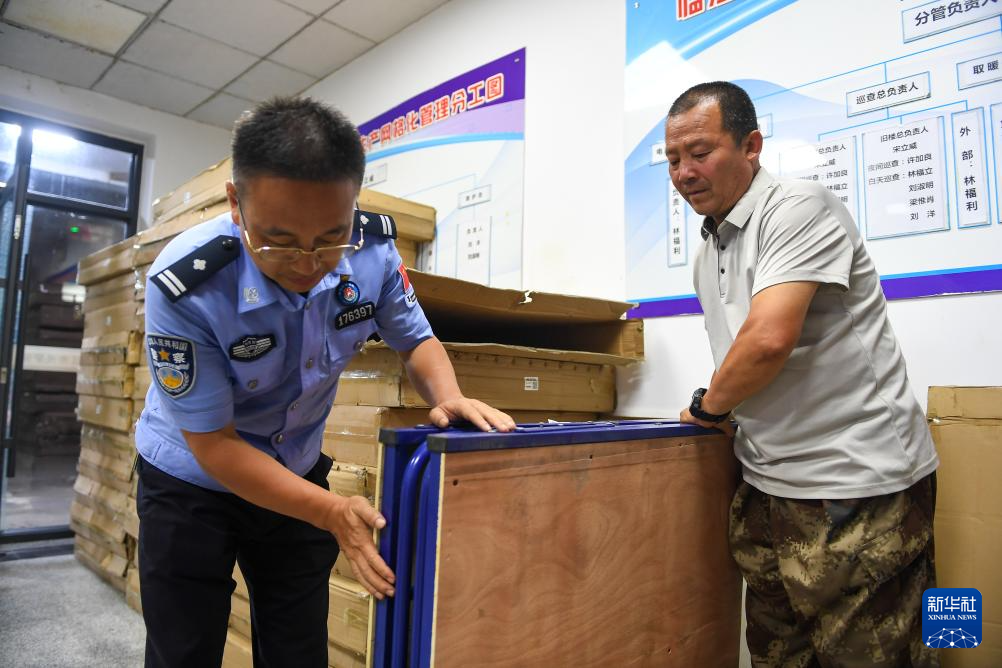 7月30日,在临城村临时安置点,临城边境派出所民警刘伟(左)与村党支部书记金勇诚为村民准备折叠床。