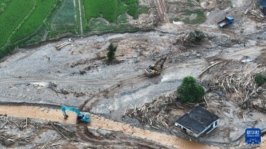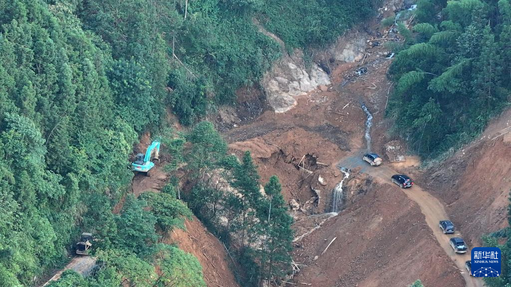 8月2日,挖掘机在资兴市白廊镇抢修道路(无人机照片)。
