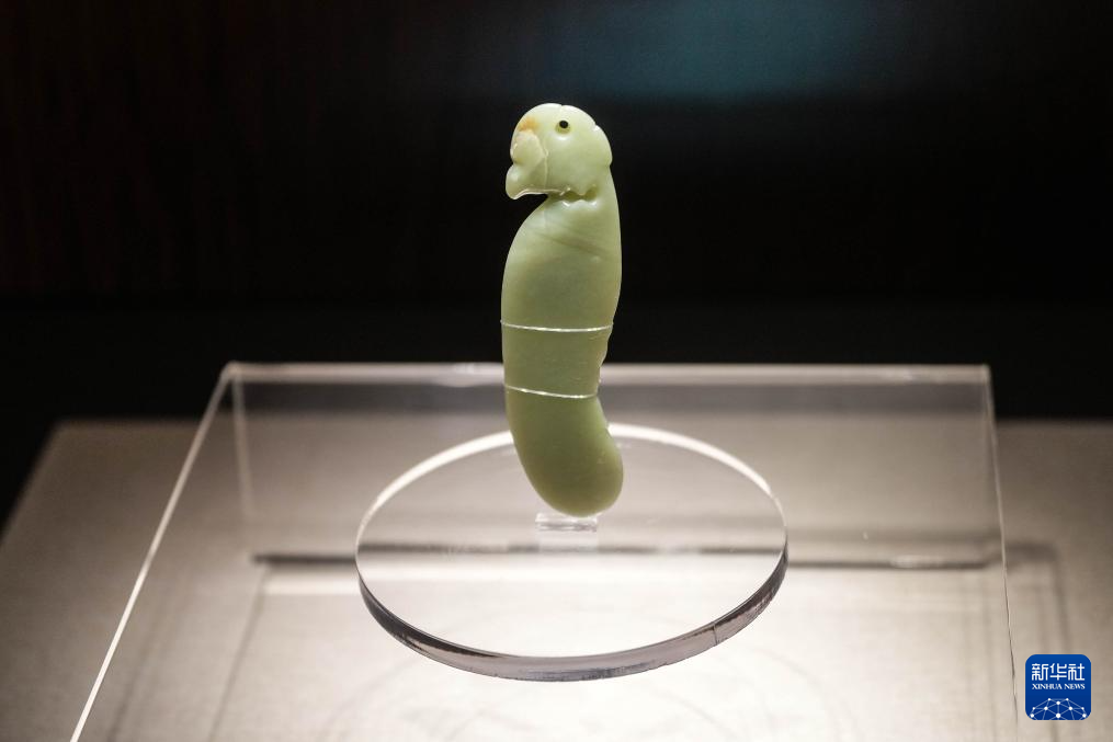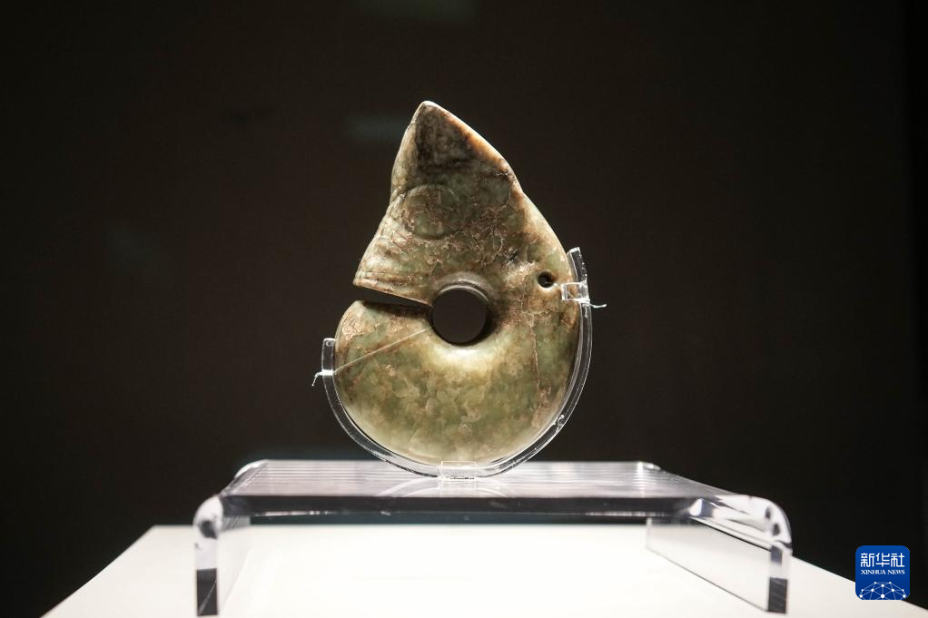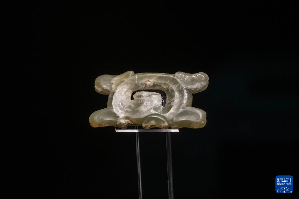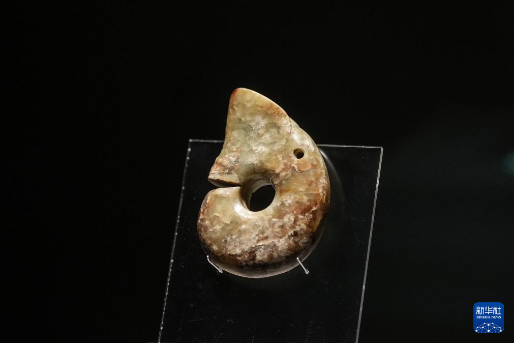 这是8月3日在牛河梁遗址博物馆拍摄的展品勾云形玉器。