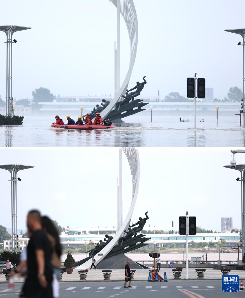 拼版照片:上图为7月30日在丹东市鸭绿江公园拍摄的雕塑(新华社记者姚剑锋摄);下图为8月3日在丹东市鸭绿江公园拍摄的雕塑(新华社记者龙雷摄)。