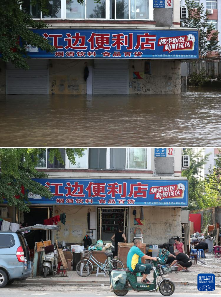 拼版照片:上图为7月30日在丹东市滨江中路拍摄的临街商铺;下图为8月3日,丹东市滨江中路的商家整理店内物品,准备营业。