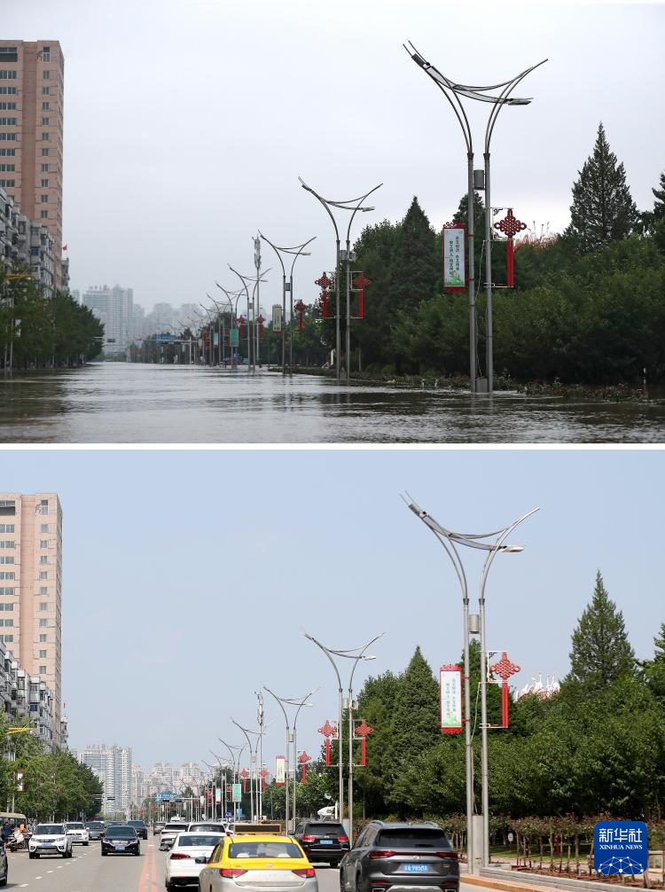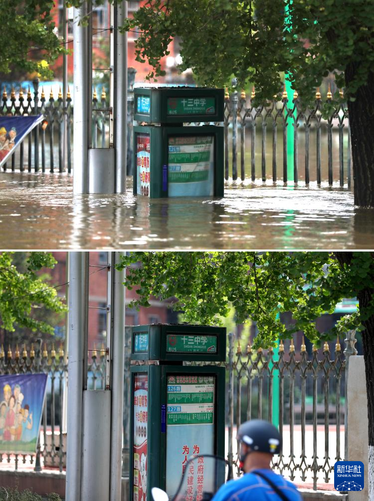 拼版照片:上图为7月30日在丹东市滨江中路拍摄的街景;下图为8月3日在丹东市滨江中路拍摄的街景。