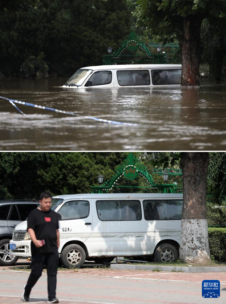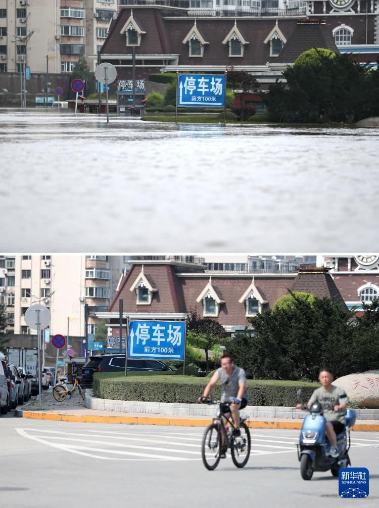 拼版照片:上图为7月30日在丹东市滨江中路拍摄的水淹车辆;下图为8月3日在丹东市滨江中路拍摄的车辆。