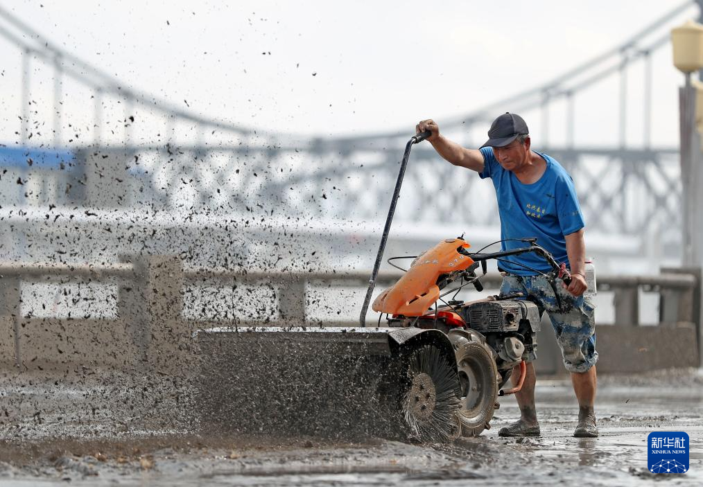 8月1日,工作人员在丹东市鸭绿江公园清理淤泥。