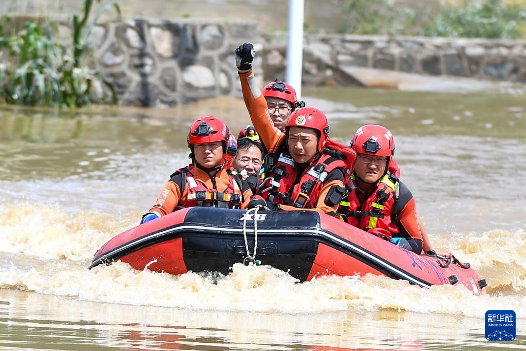 7月29日,在吉林省临江市,临江市消防救援大队世纪大街站副站长白云天(右二)在转运受困群众时,用手势指挥队员操控船只。