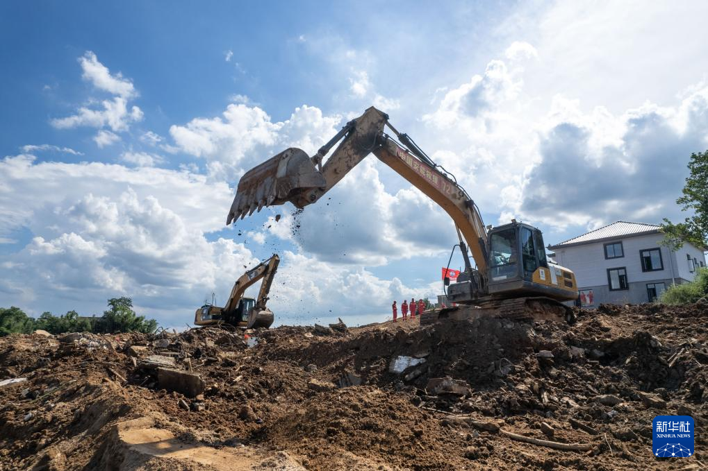 7月31日,在湖南湘潭县四新堤,抢险人员操作挖掘机修复损毁的堤段(无人机照片)。