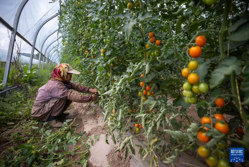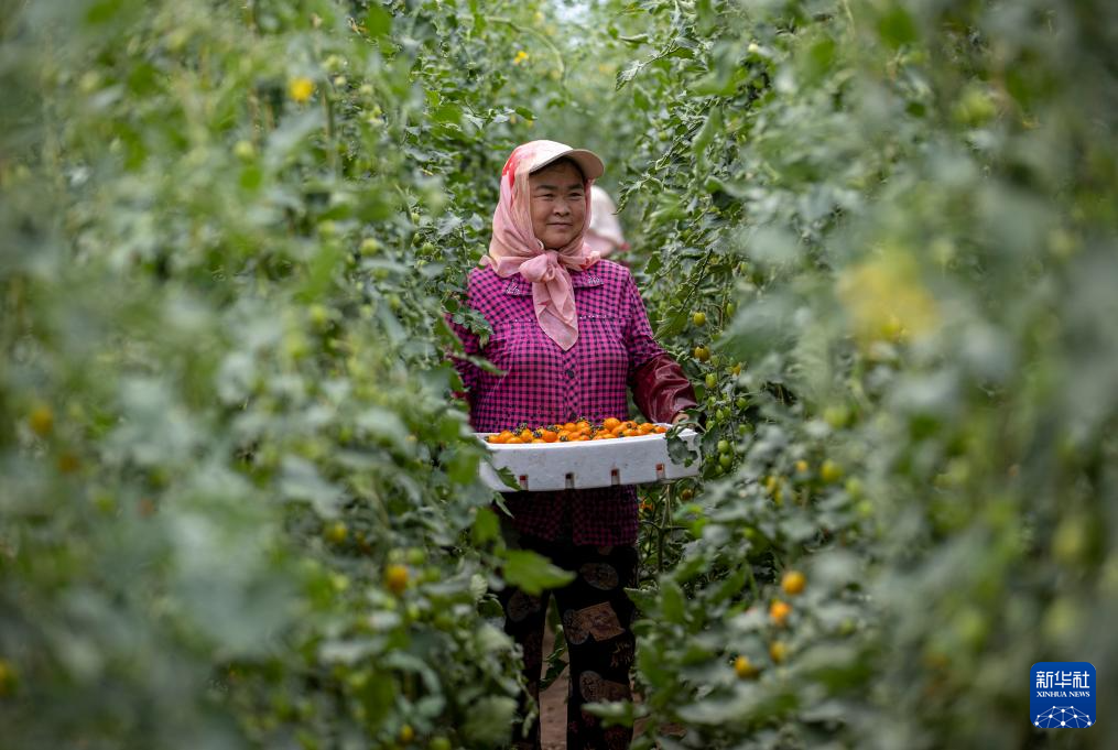 8月2日,在宁夏固原市隆德县沙塘镇设施蔬菜高产高效示范基地的小番茄温室内,农户收获小番茄。