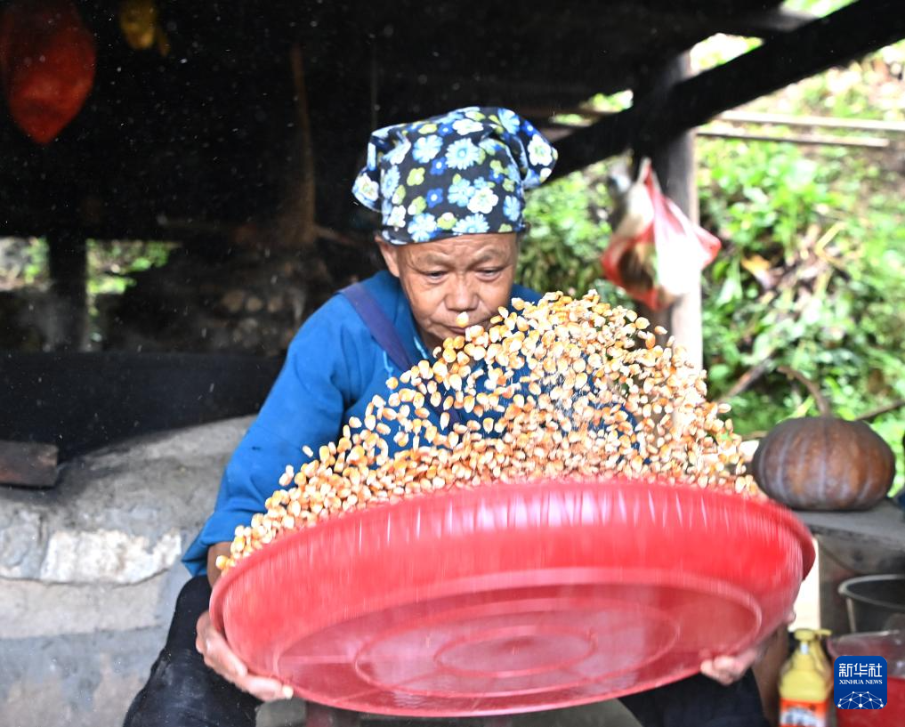 村民王秀兰在那岩屯木寨筛玉米(7月30日摄)。