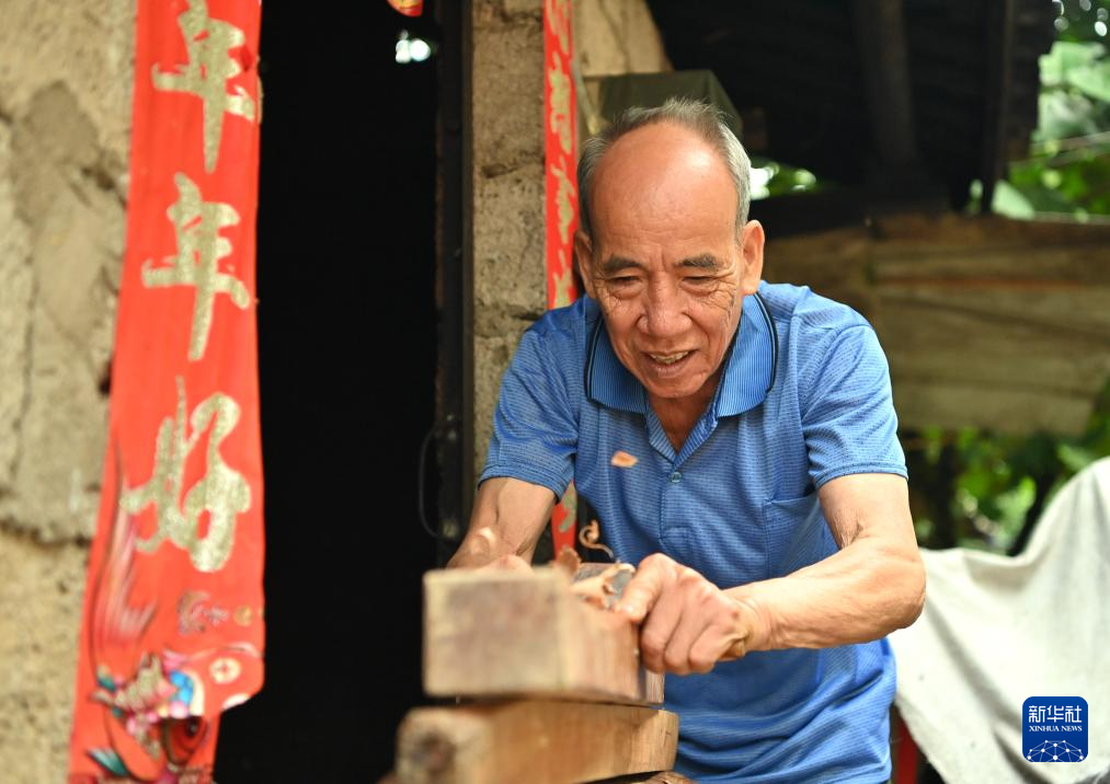 村民何正兴在那岩屯木寨的家里刨木头(7月30日摄)。