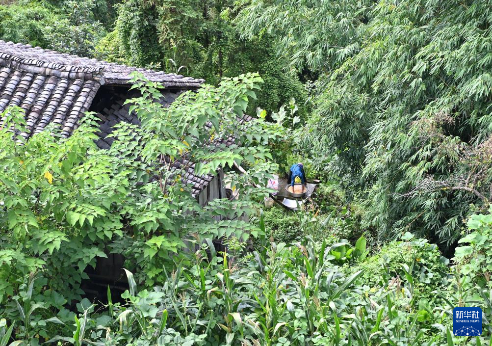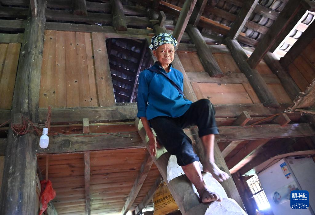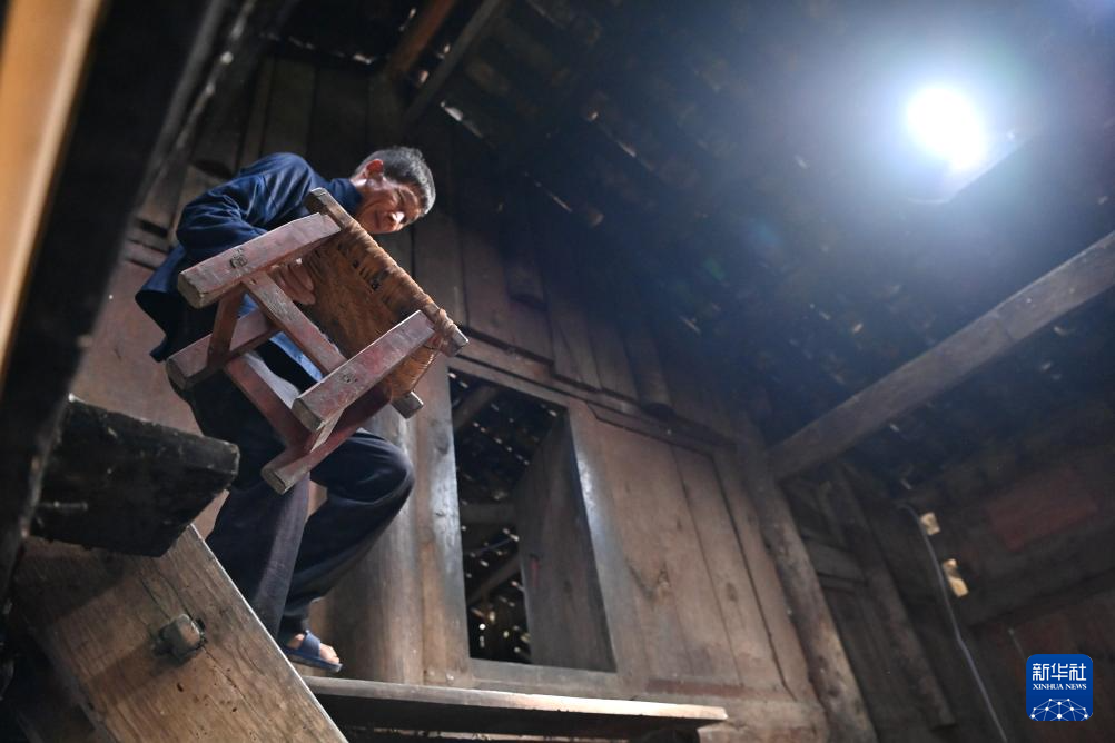 村民熊正文在那岩屯木寨的家里拿凳子下楼梯(7月30日摄)。利用明瓦取光是木寨建筑的一大特色。