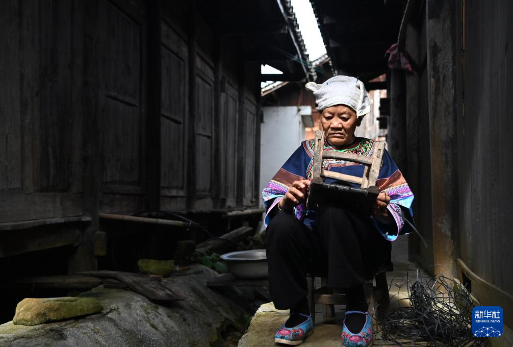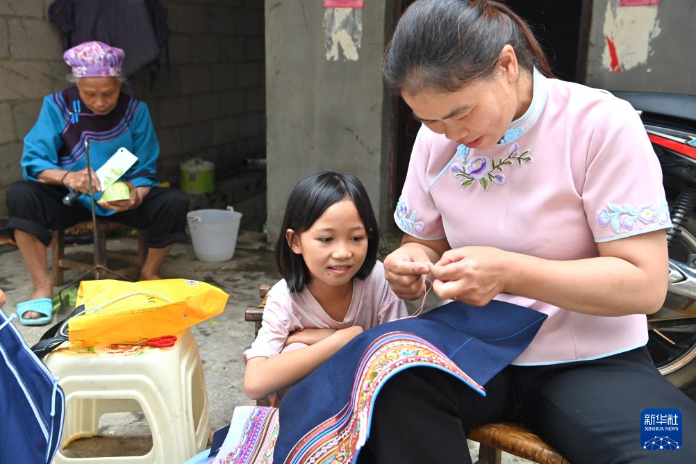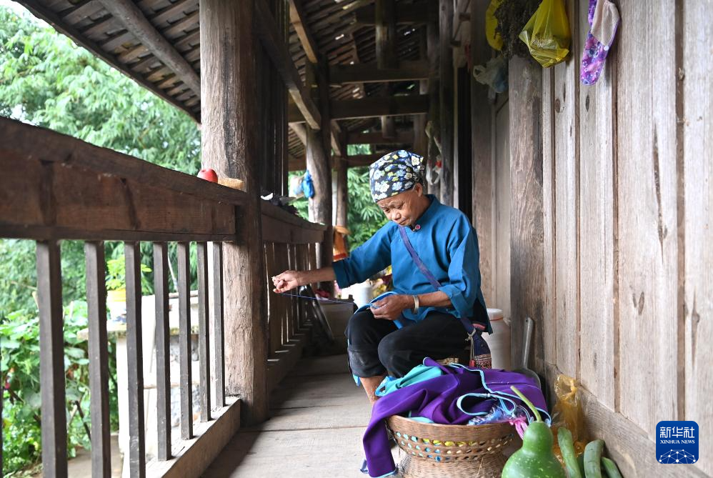 村民王秀兰在那岩屯木寨的家里刺绣(7月30日摄)。