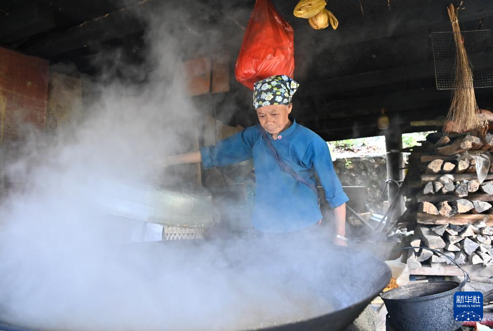 村民王秀兰在那岩屯木寨煮玉米(7月30日摄)。