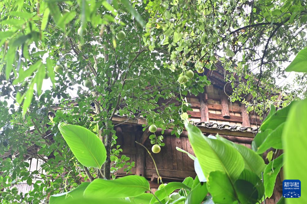 这是那岩屯木寨一座木楼前茂盛的柚子树(7月30日摄)。