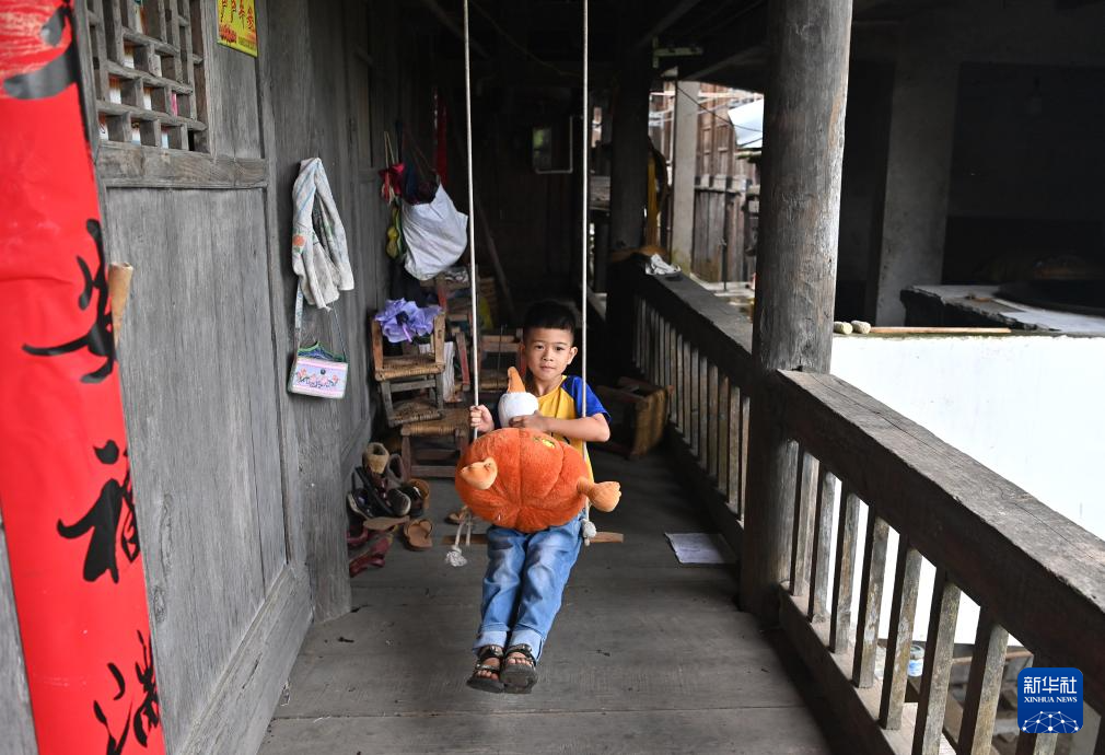 6岁的岑俊宇在那岩屯木寨荡秋千(7月30日摄)。