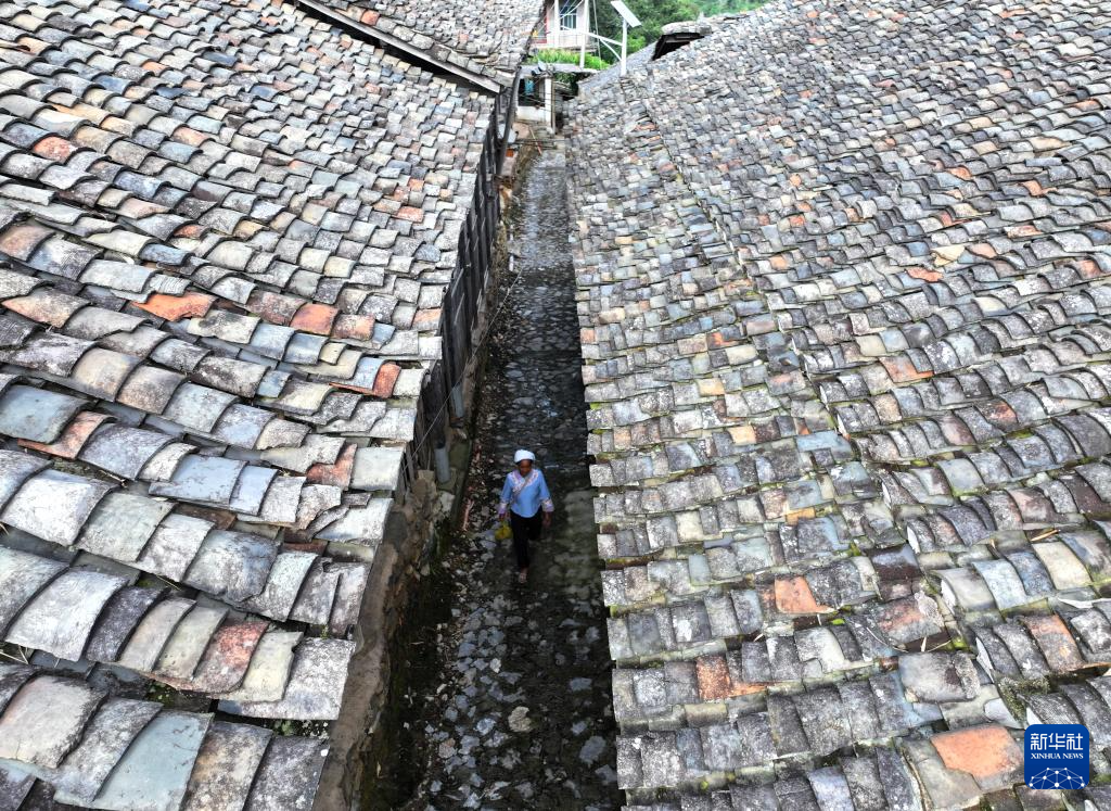 村民王凤兰走在那岩屯木寨巷道上(7月30日摄,无人机照片)。