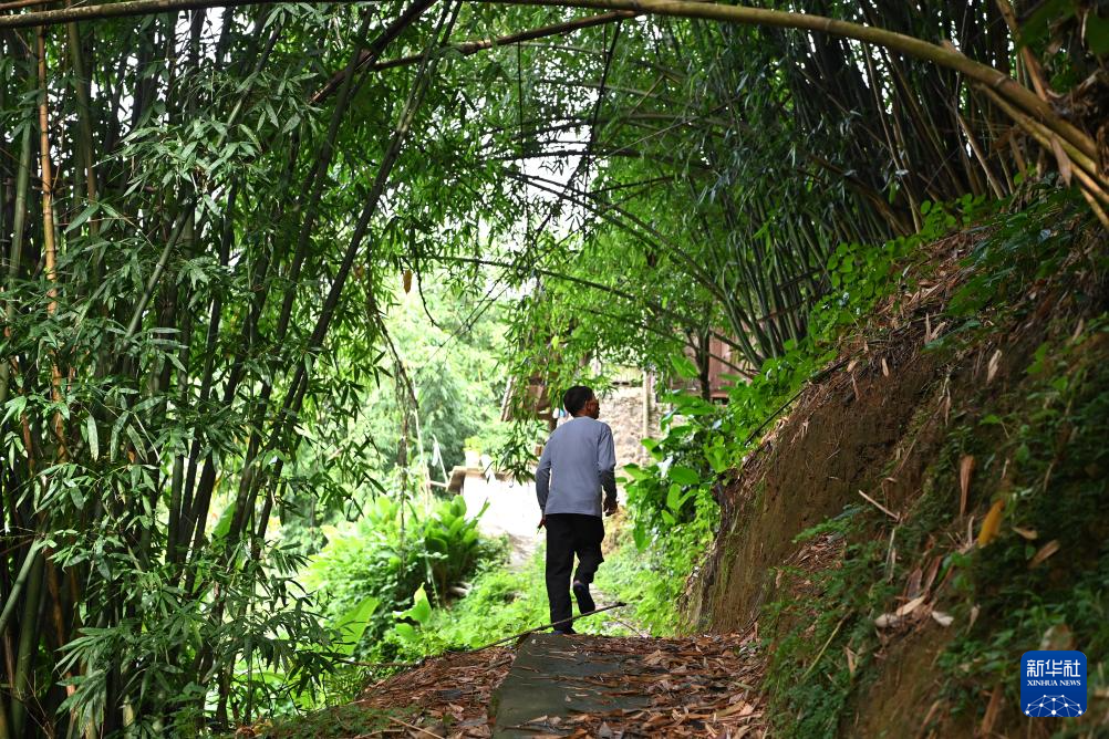 村民熊正文走在那岩屯木寨的村道上(7月30日摄)。