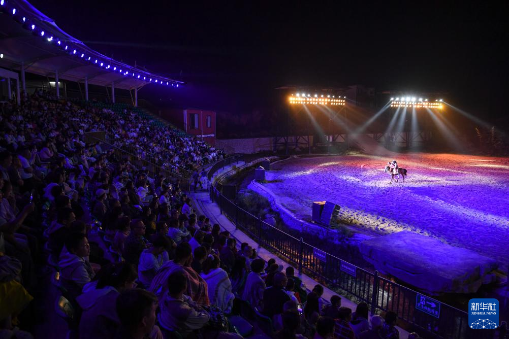 8月2日,游客在观看关山草原景区的实景演艺《大秦关山》。