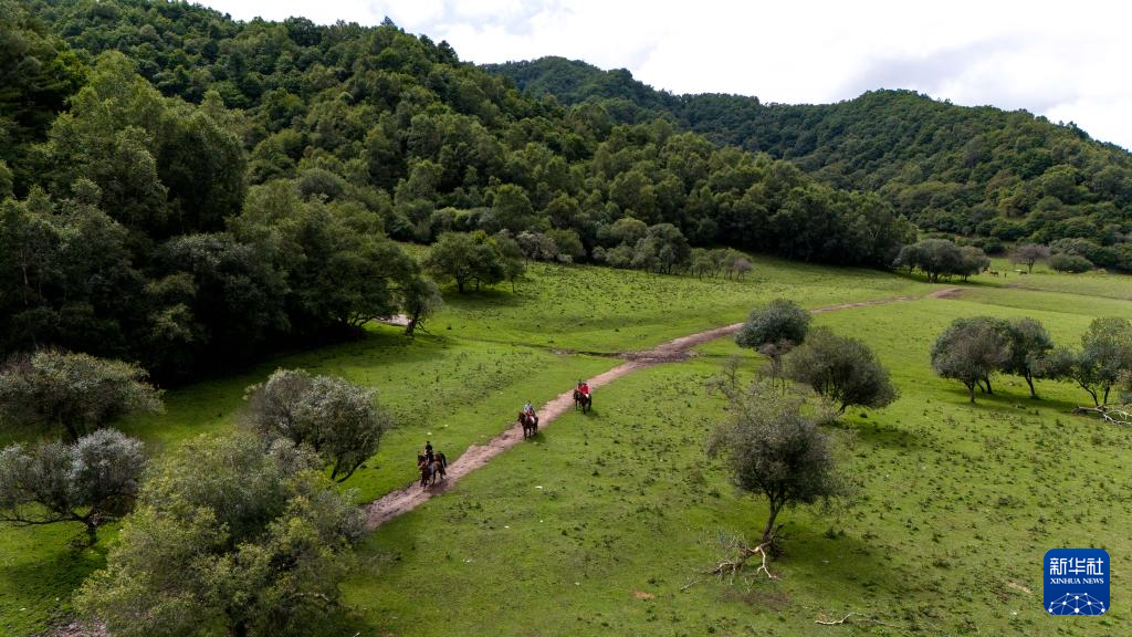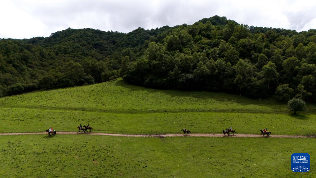8月3日,游客在关山草原景区的一处马场骑马(无人机照片)。
