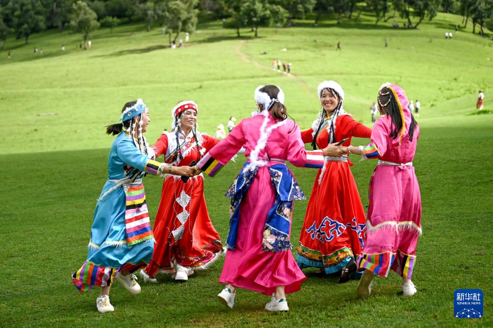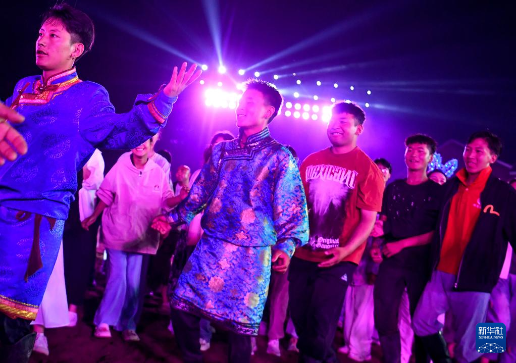 8月2日,游客在观看关山草原景区实景演艺《大秦关山》后参与集体联欢。