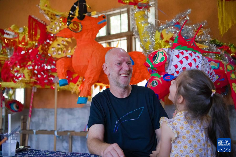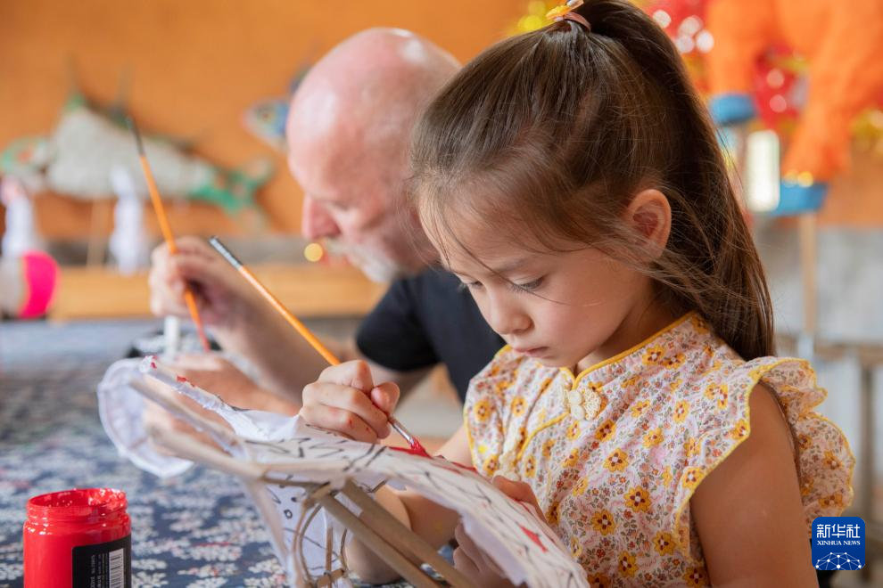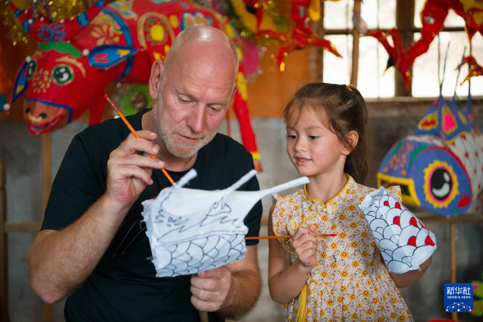 8月1日,在黄山市黟县宏村研学基地,阿明(左)和女儿阿琳娜一起为鱼灯上色。