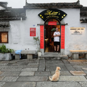 7月11日,在黄山市黟县宏村的阿琳娜披萨咖啡店,阿明在店门口留影。