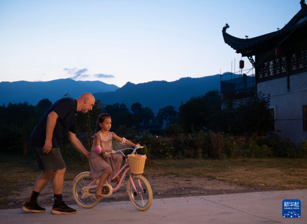 8月1日,在黄山市黟县塔川村,阿明(右)在自家经营的民宿里看着女儿阿琳娜试骑新买的自行车。