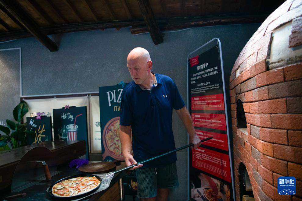 7月31日,在黄山市黟县宏村的阿琳娜披萨咖啡店,阿明在制作披萨。