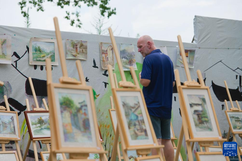 7月31日,在黄山市黟县宏村,阿明在欣赏关于宏村的画展作品。