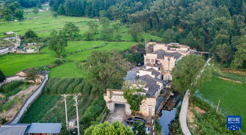 这是7月31日在黄山市黟县塔川村拍摄的阿明一家经营的民宿和周围环境(无人机照片)。