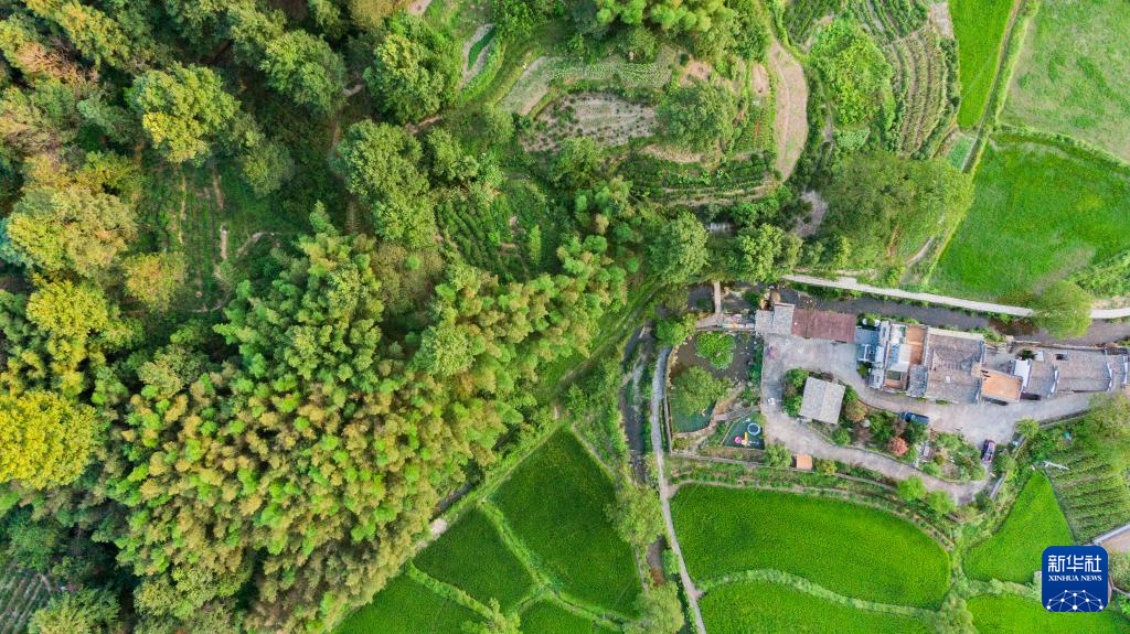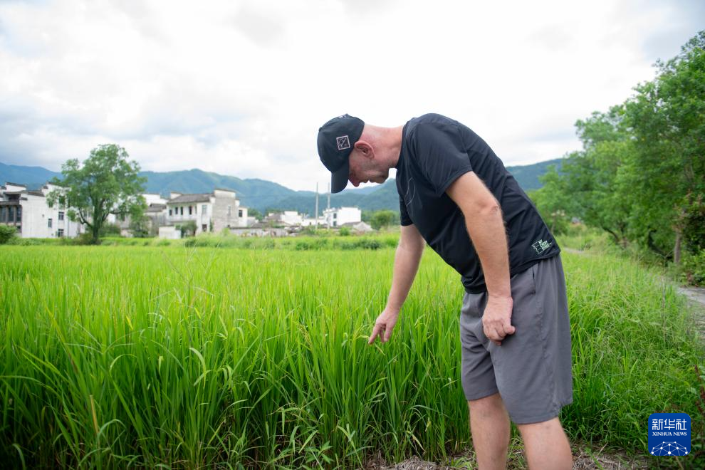 8月1日,在黄山市黟县塔川村,阿明在自家经营的民宿周围查看水稻长势。
