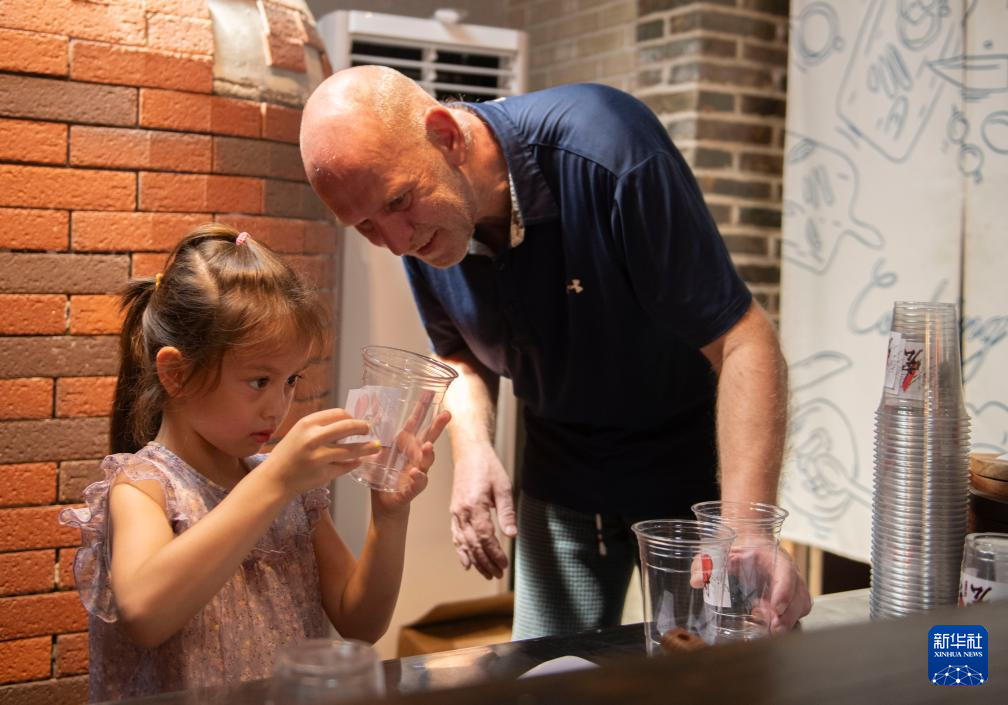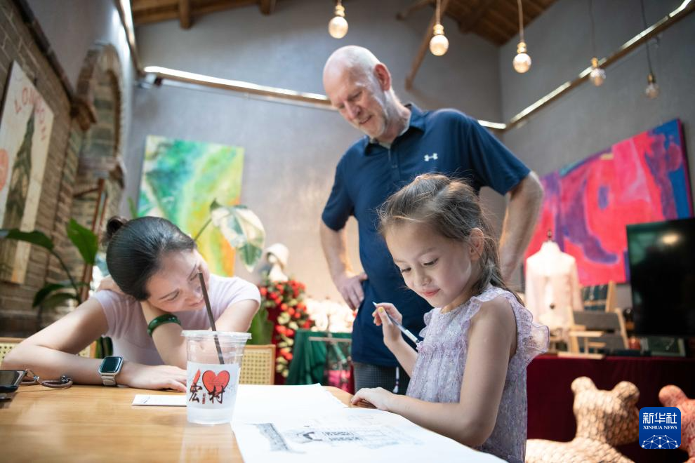 8月1日,阿明(左)和女儿阿琳娜在黄山市黟县宏村研学基地里互动。