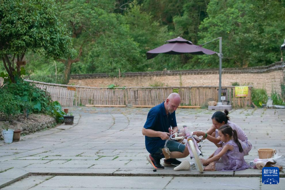 7月31日,在黄山市黟县塔川村,阿明(左)在自家经营的民宿里给女儿阿琳娜组装自行车。