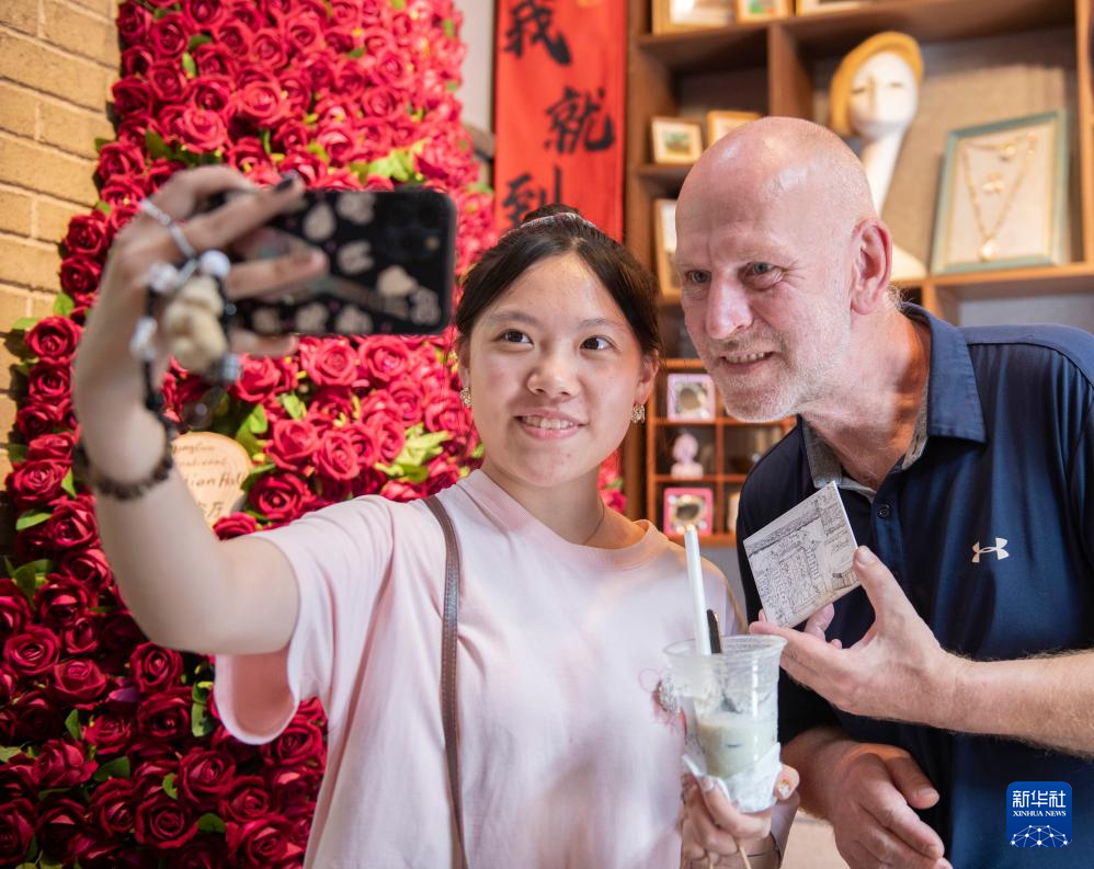 7月31日,在黄山市黟县宏村的阿琳娜披萨咖啡店,阿明(右)与顾客合影。