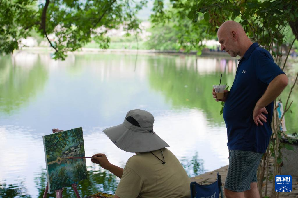 7月31日,在黄山市黟县宏村,阿明(右)在一名写生爱好者身旁驻足。