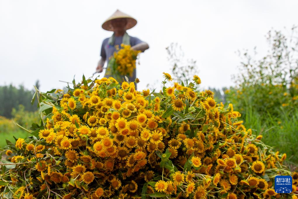8月6日,农民在山东省淄博市高青县黑里寨镇采收中药材。