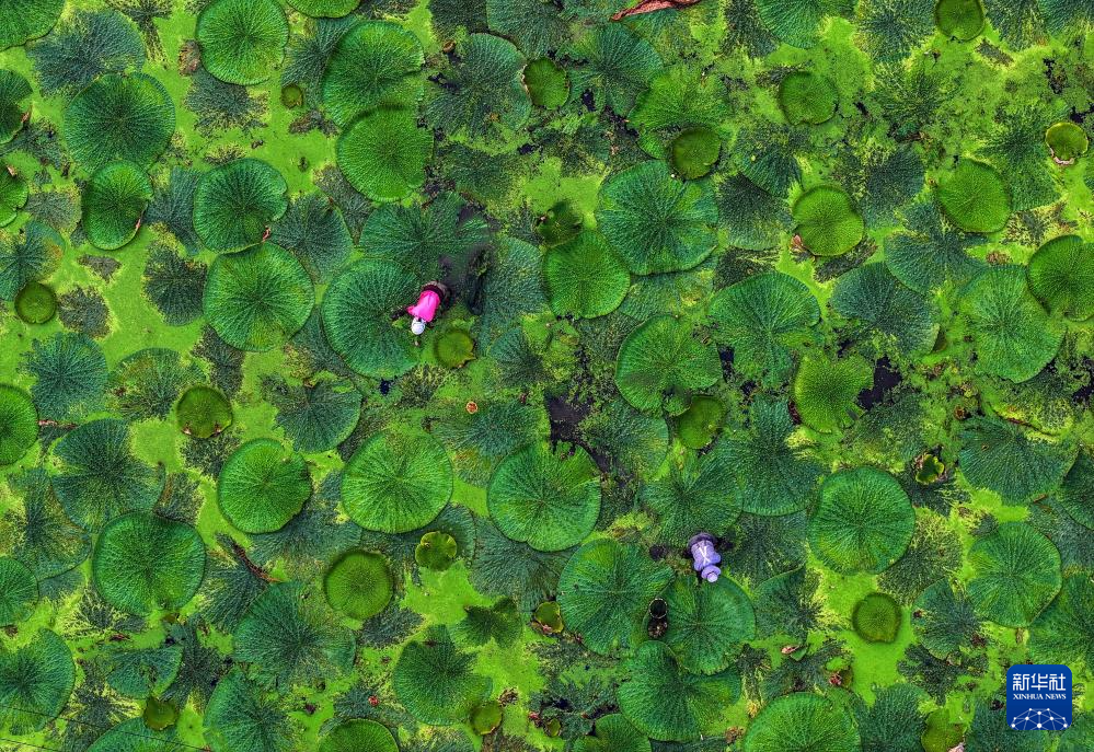 8月6日,农民在江苏泰州靖江市东兴镇惠圣村采收芡实(无人机照片)。