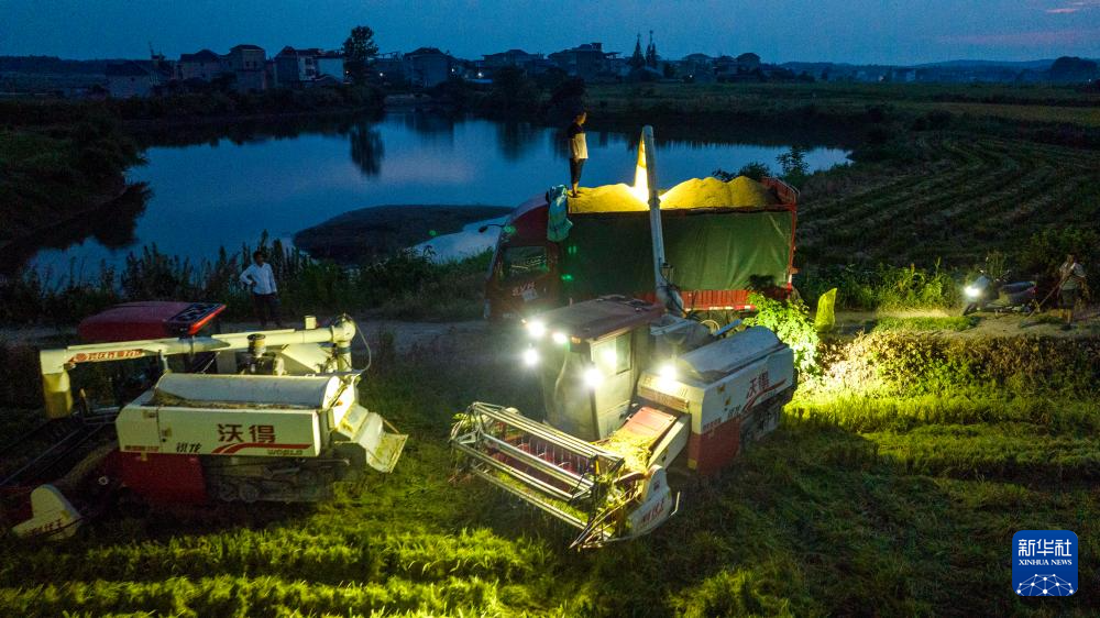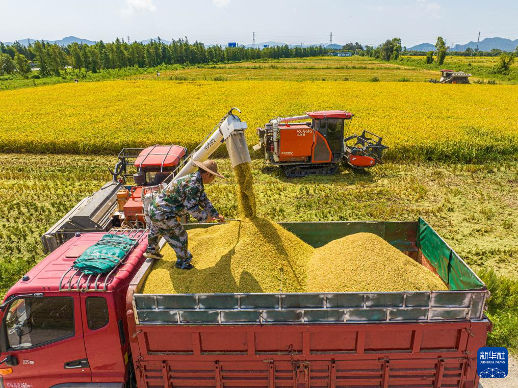 8月5日,在江西省九江市都昌县蔡岭镇杨湾村,农机手将收获的水稻装车转运(无人机照片)。