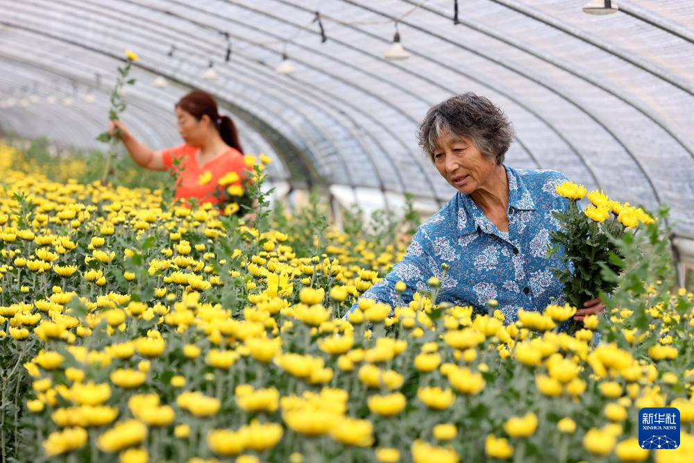 8月6日,山东省枣庄市光明路街道十里泉村农民在大棚里采收菊花。