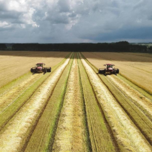8月3日,在北大荒集团黑龙江红五月农场有限公司第五管理区,大型收割机在进行拾禾作业。