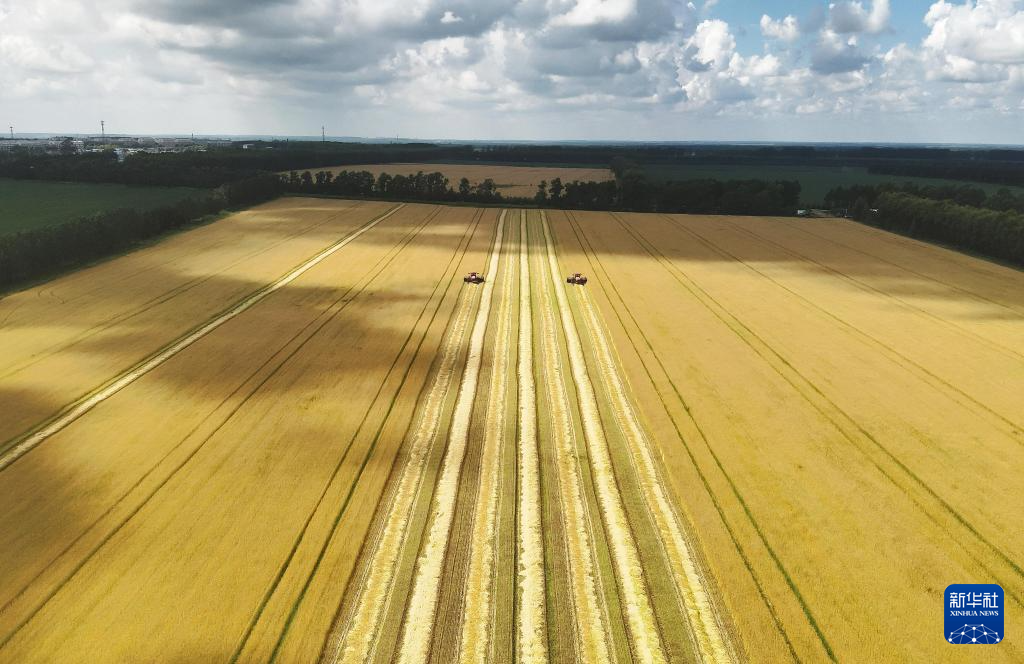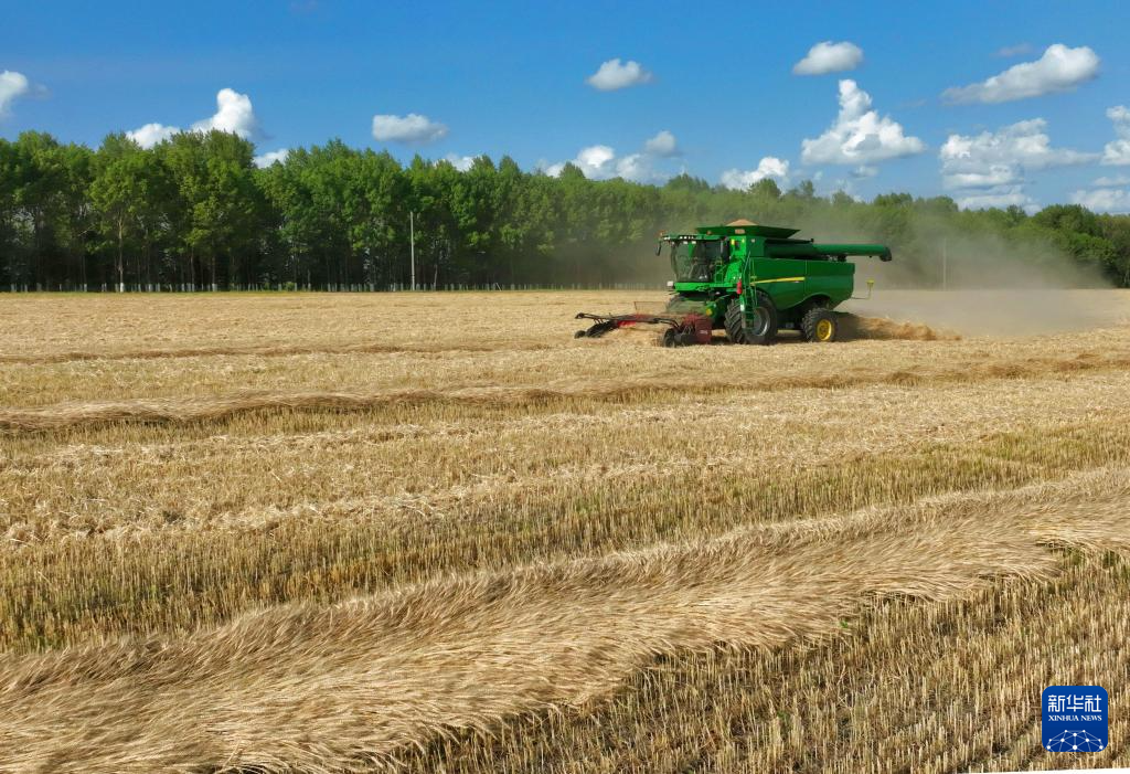 8月6日,在北大荒集团黑龙江红星农场有限公司,大型农机在收获小麦(无人机照片)。
