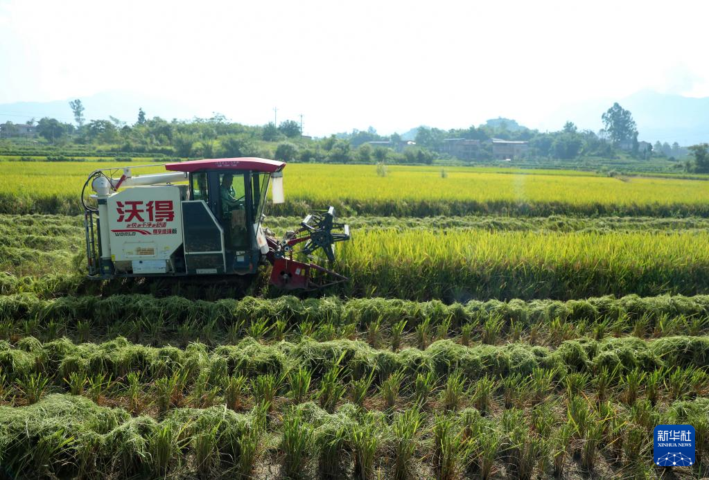 8月6日,四川省华蓥市阳和镇鸽笼山村农民利用收割机在田间收割水稻。