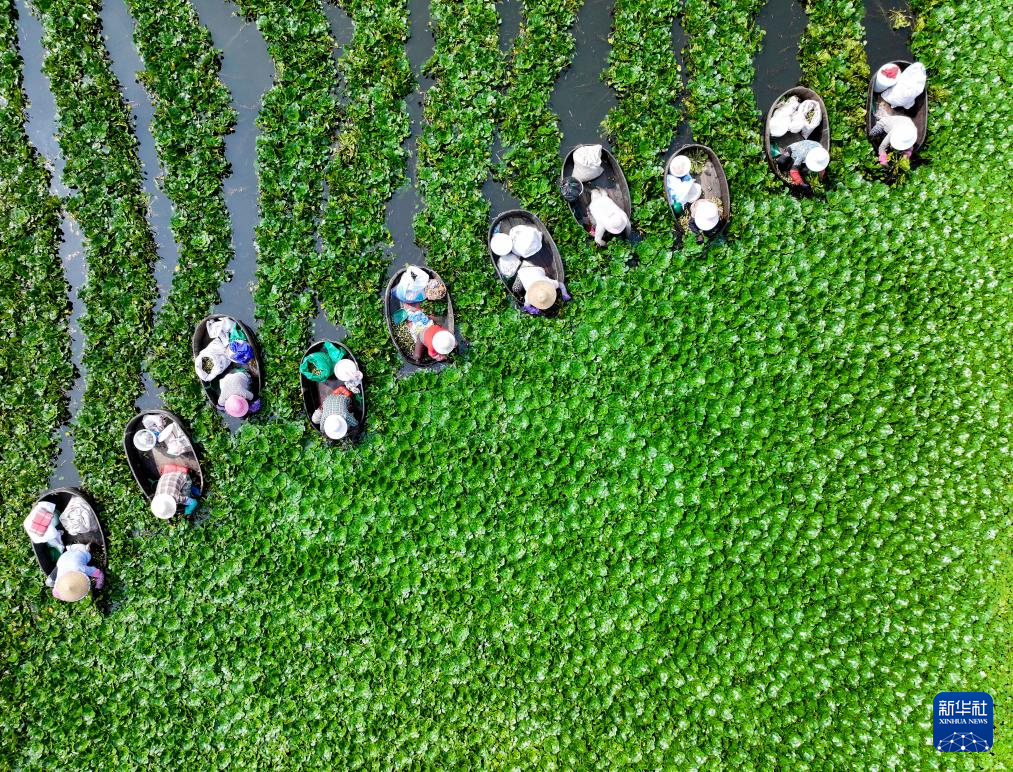 8月6日,在江苏省淮安市洪泽区岔河镇,农民在采摘菱角(无人机照片)。