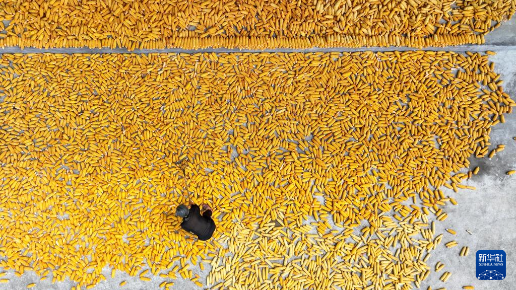 8月6日,重庆市酉阳土家族苗族自治县李溪镇寨坝村农民在晾晒玉米(无人机照片)。
