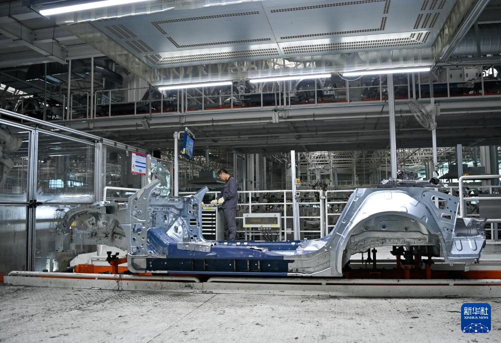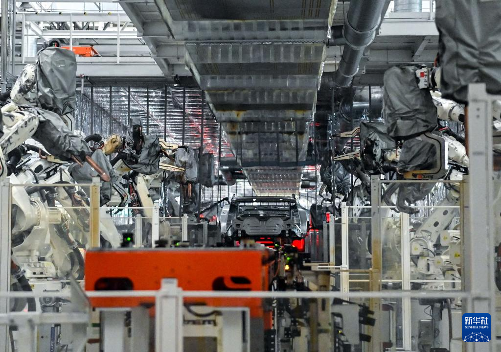 8月5日,在位于吉林省长春市一汽红旗制造中心繁荣厂区的焊装车间内,焊装机器人在生产线上焊接车身。