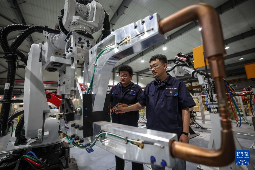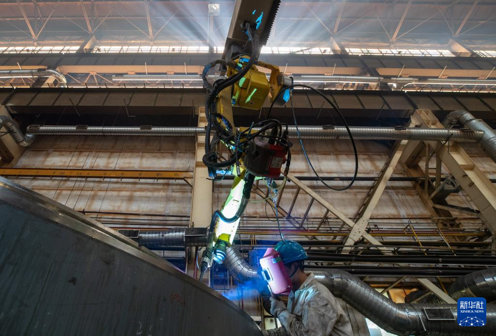 7月13日,在哈电集团哈尔滨电机厂有限责任公司生产车间,工人在检查焊接机器人的作业情况。