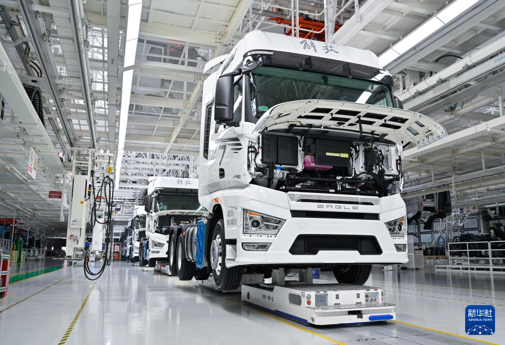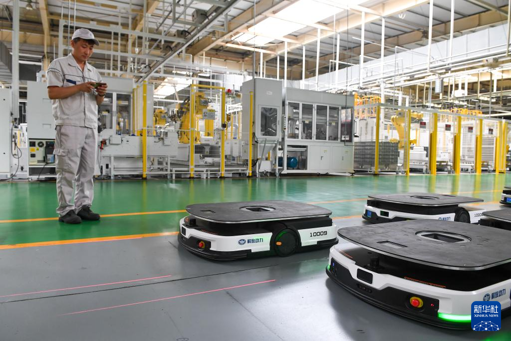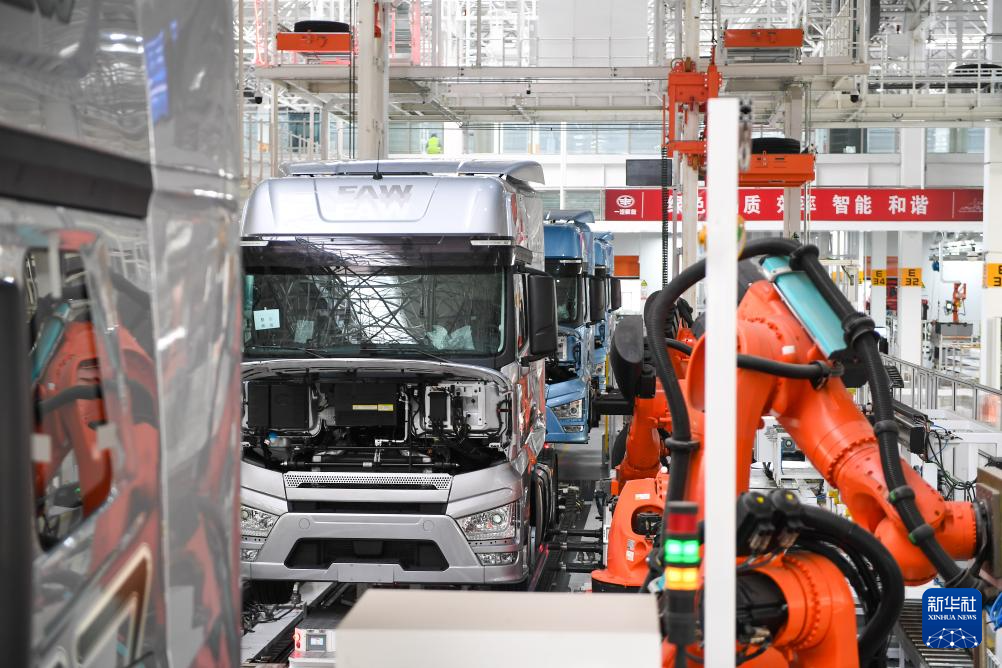7月16日,在位于吉林省长春市的一汽解放汽车有限公司J7智能工厂内,AGV搬运机器人搬运卡车等待下线。